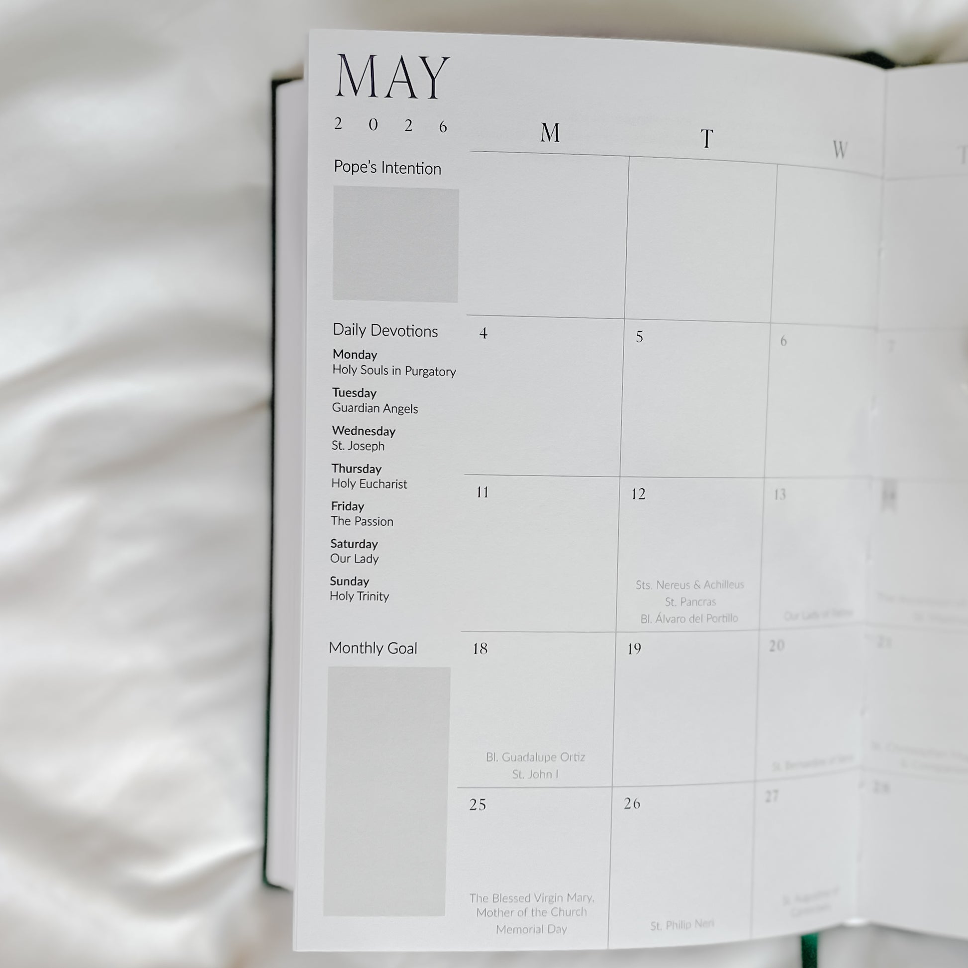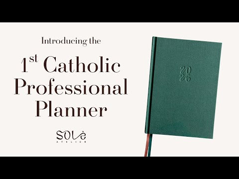 I use a prayer journal everyday, and for the past 6 years I've been using a blank-inside secular-brand journal, which has come to be my favorite because it is simple, beautifully bound in linen, has a ribbon bookmark, an elastic strap, and narrow lines for journaling. I've never been able to find a journal like it---let alone a Catholic or faith-based one---until now! Solé Atelier has come out with a book that combines the best aspects of my favorite prayer journal and my Google Calendar. Like my favorite prayer journal, it's simple and elegant, linen-bound, has the ribbon bookmark, elastic strap, thin lines for writing, blank pages for journaling between every week (I love that part!), but best of all, is Catholic.